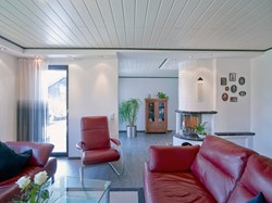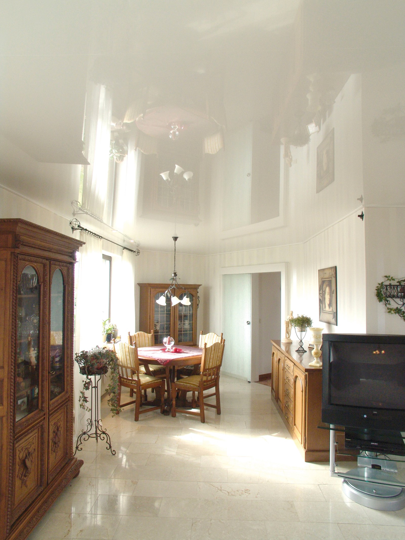 Nachher: Dieser Raum ist kaum wiederzuerkennen. Ohne Ausräumen der Möbel und in nur einem Tag montierten wir eine weiße hochglänzende Spanndecke direkt unter die vorhandene Holzdecke.